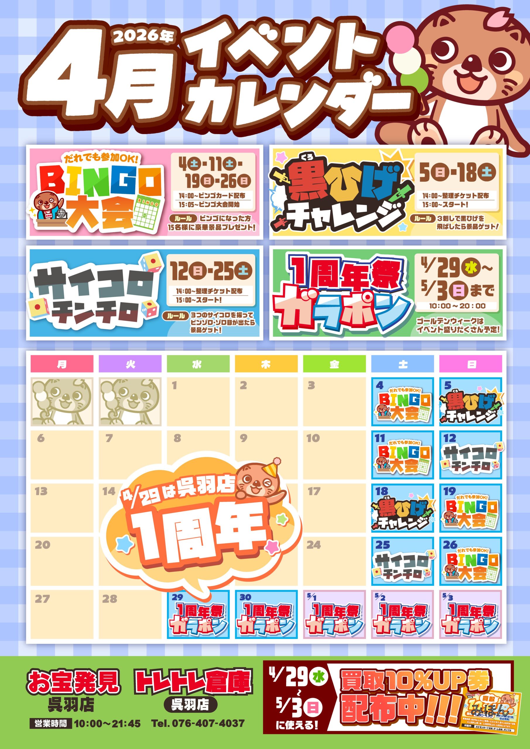 TOP 2026年4月3日 by admin SNSも随時更新中です★ 新着情報 4/18新景品入荷情報🌸 4/17 新景品✨️ 4/16 新景品✨️ 4/14新景品入荷情報‼️ 4/10新景品入荷情報‼️ 4/9新景品入荷情報‼️ 4/8 新景品入荷情報‼️ SNS投稿キャンペーン✨️ 4/4新景品‼️ Webチラシ 店舗紹介 お宝発見呉羽店 トレトレ倉庫 キッズスペース完備