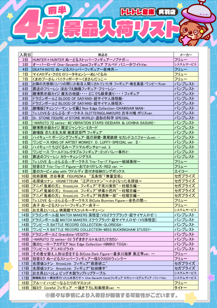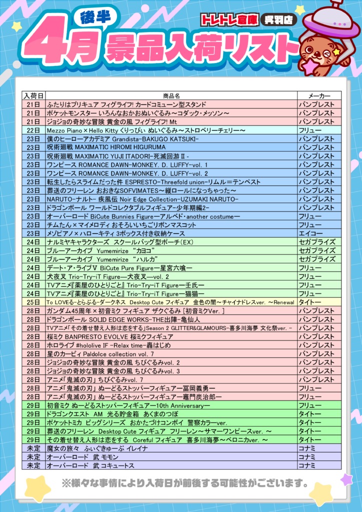 4月景品入荷リスト❣️