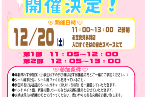 いつもお宝発見呉羽店をご利用いただき誠にありがとうございます。 前回のシール交換会が好評だったため、2回目の開催を決定いたしました! 今回は第1部・第2部開催となっております。 ご予約の方優先となって...