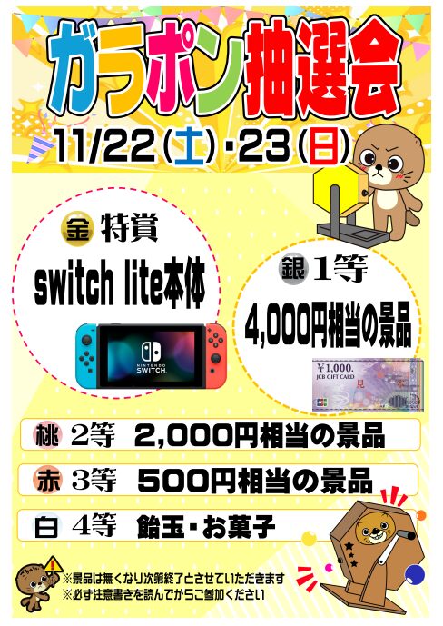 webチラシ/新着情報 今月のガラポンイベント景品おしらせ! 2025年11月21日 by kureha_staff ガラポンイベントは18:00までとなっております。 上記表示景品以外も豪華景品のご用意ございます!! ぜひお越しくださいませ!!! X